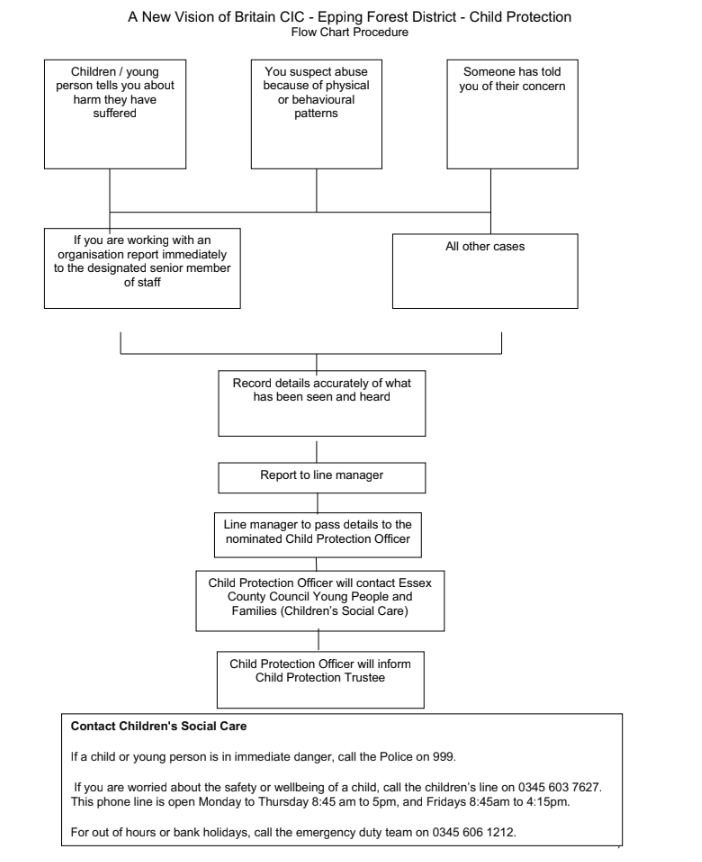 - If there is fear of immediate risk or harm to the child or young person seek help from Police, Essex County Council Children Young People and Families or Medical Staff immediately that the child or young person has finished their disclosure. In any case, the Child Protection Officer must be contacted as soon as possible.